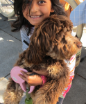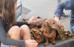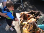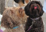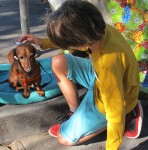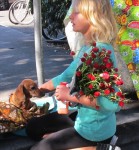 Then came the magic. Children stopped to look at the dogs and ask permission to pet them. Others in strollers were lifted out by their parents so they could inspect Ginger & Peaches up close. Parents with toddlers paused and demonstrated to their children how to pet the dogs. The dogs relish the affection and attention. Nancy says that when they get home from the market, they fall asleep quickly and dream of that day’s adventure.